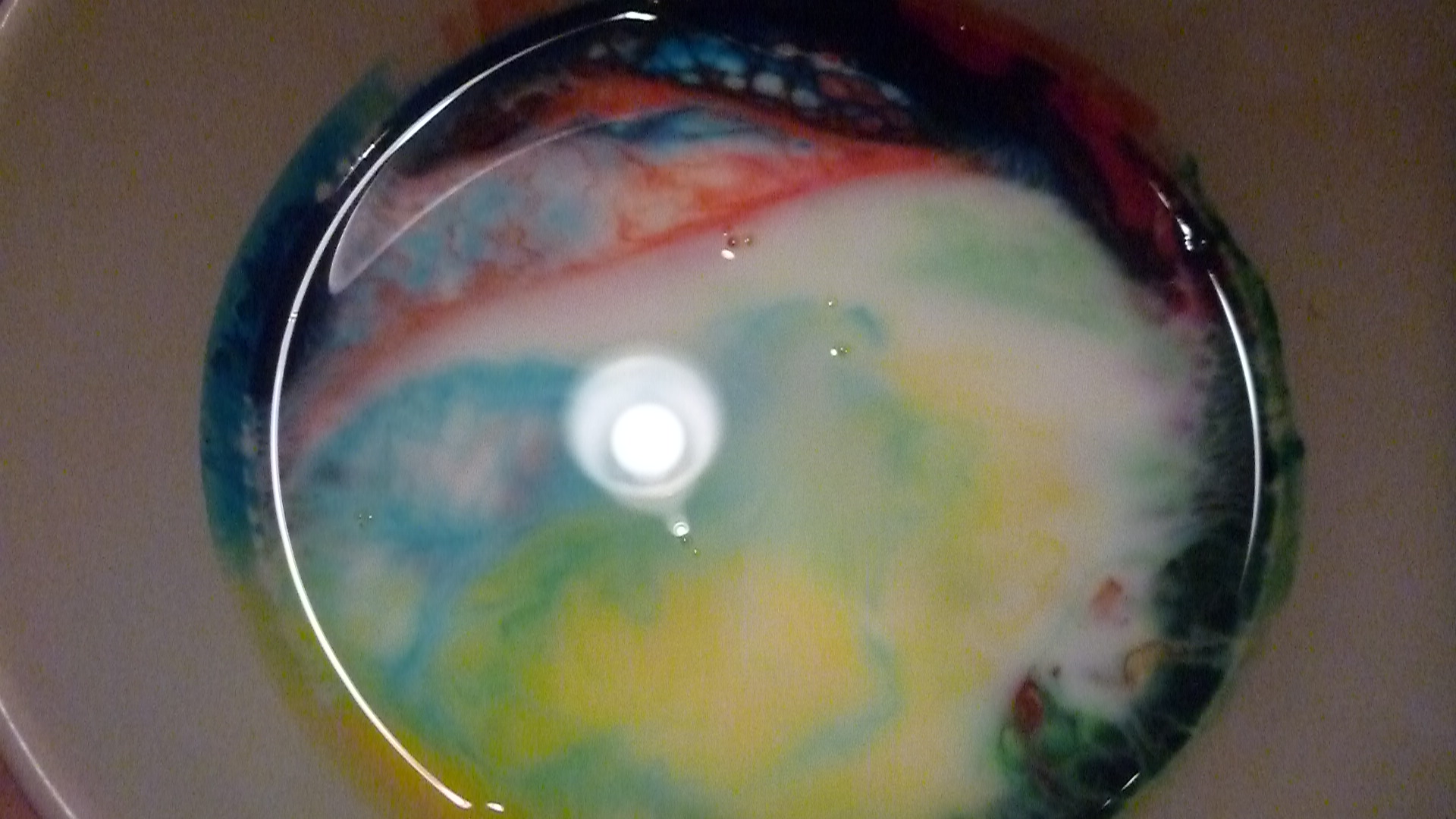 You will need: flat bowl or deep plate, dish washing liquid, different coloured food colouring and milk.