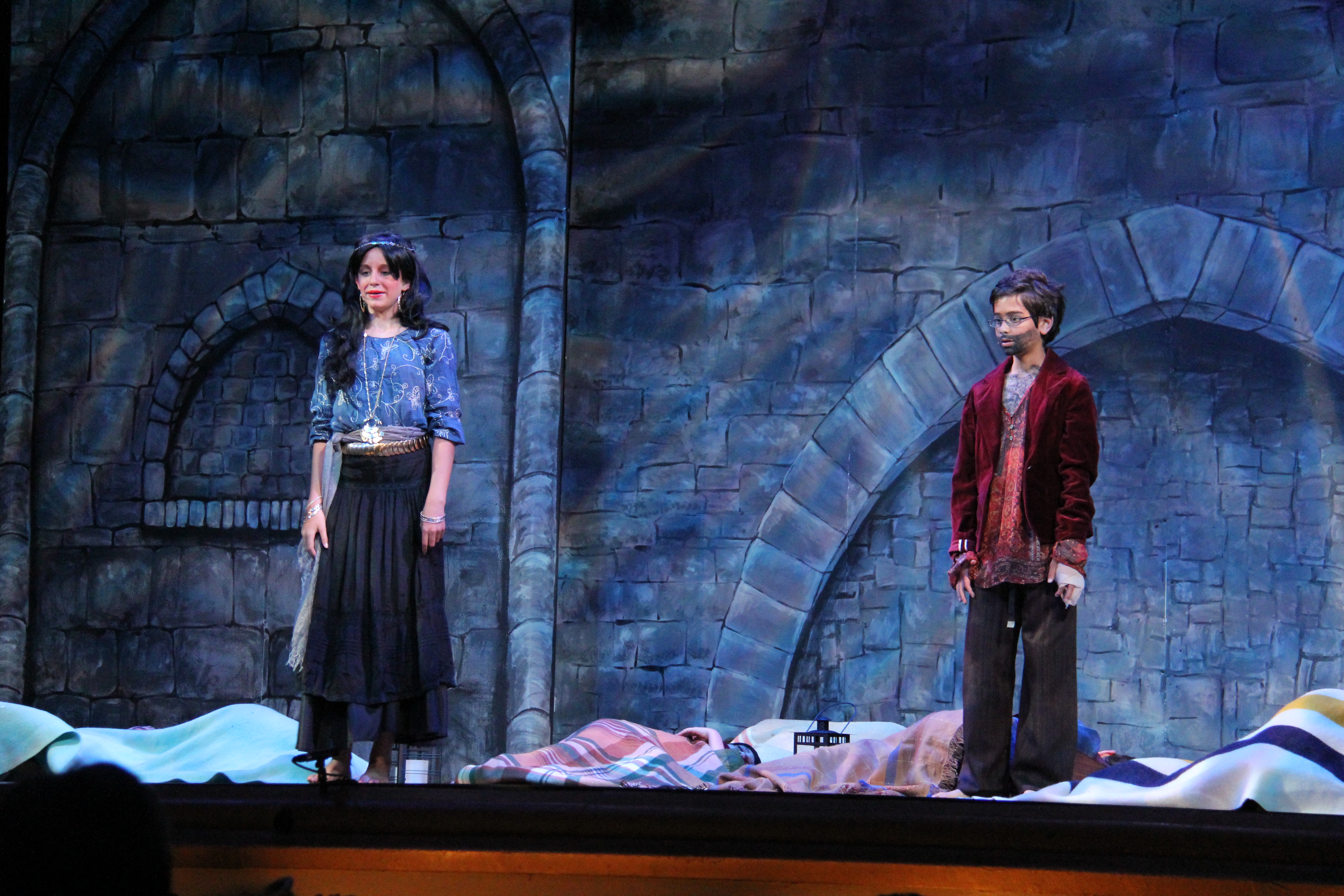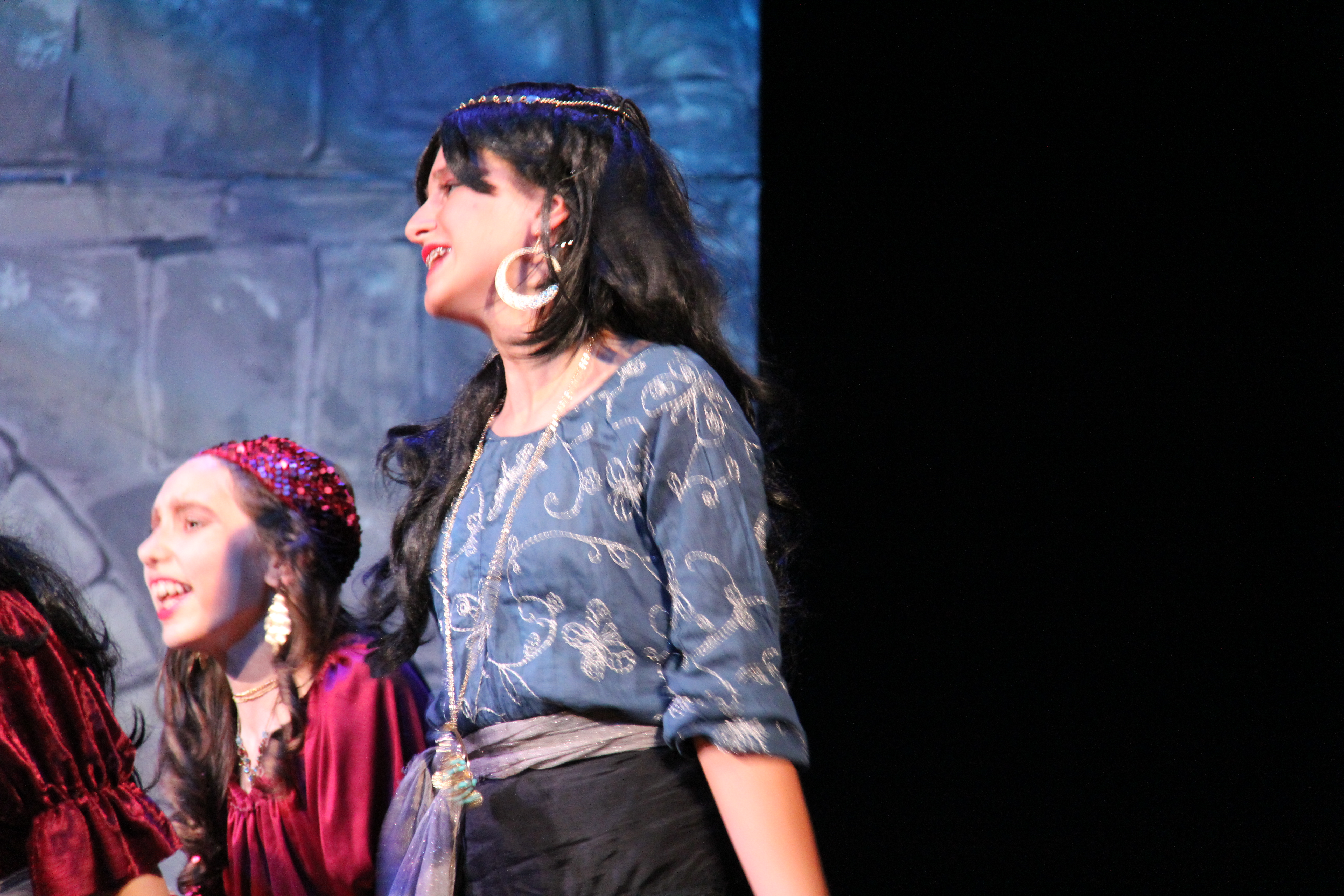 Other times we got pulled out for costumes. My costume included a long black skirt, a blue ruffly shirt, a silver scarf/stash, a gold belt over top the stash. It was very hot underneath all of the layers!